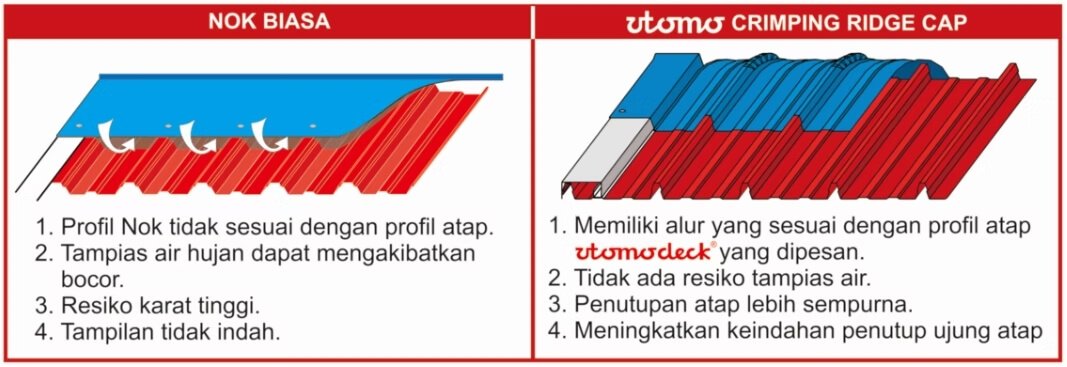 Sebagai bentuk inovasi, Utomodeck menghadirkan Nok Crimping, yaitu sistem nok yang dirancang mengikuti profil atau lekukan atap secara presisi. Dengan metode ini, nok dapat terpasang lebih rapat dan menyatu sempurna dengan lembar atap, sehingga tidak menyisakan celah yang berpotensi menimbulkan tampias air maupun kebocoran.